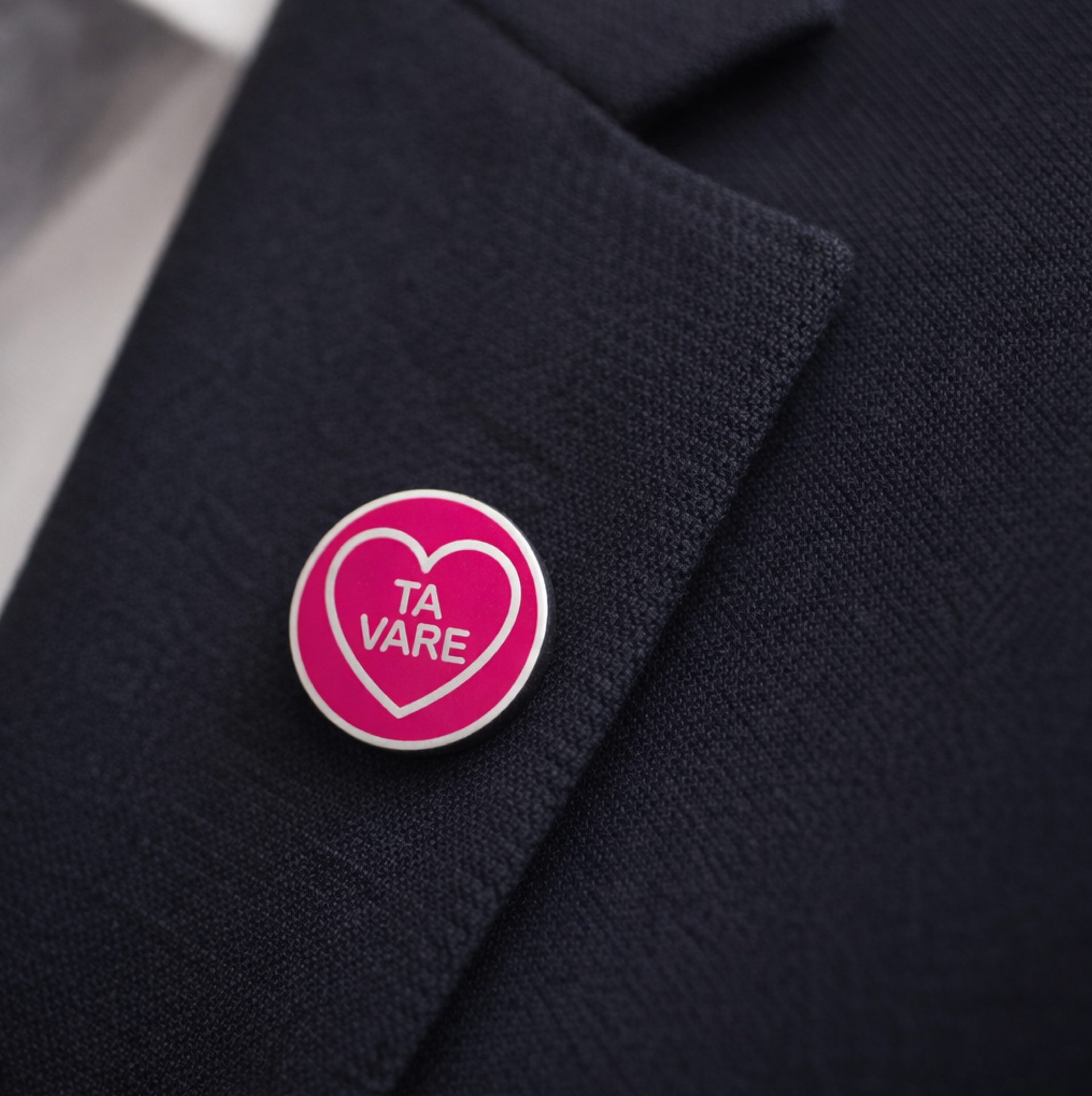 Small jacket pins visually inspired by the Love Hearts candy are the main idea of this nationwide campaign. This is the TA VARE concept.